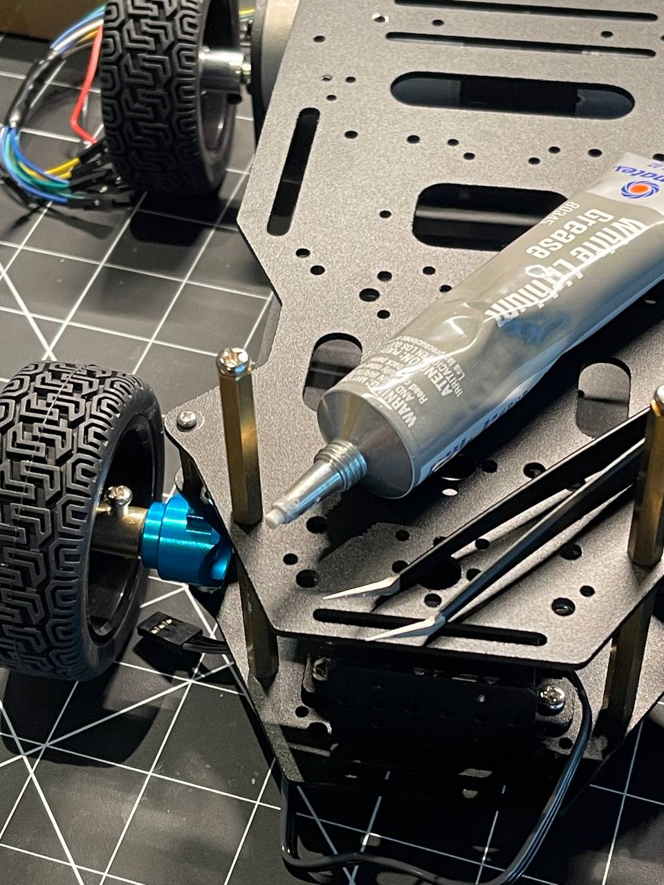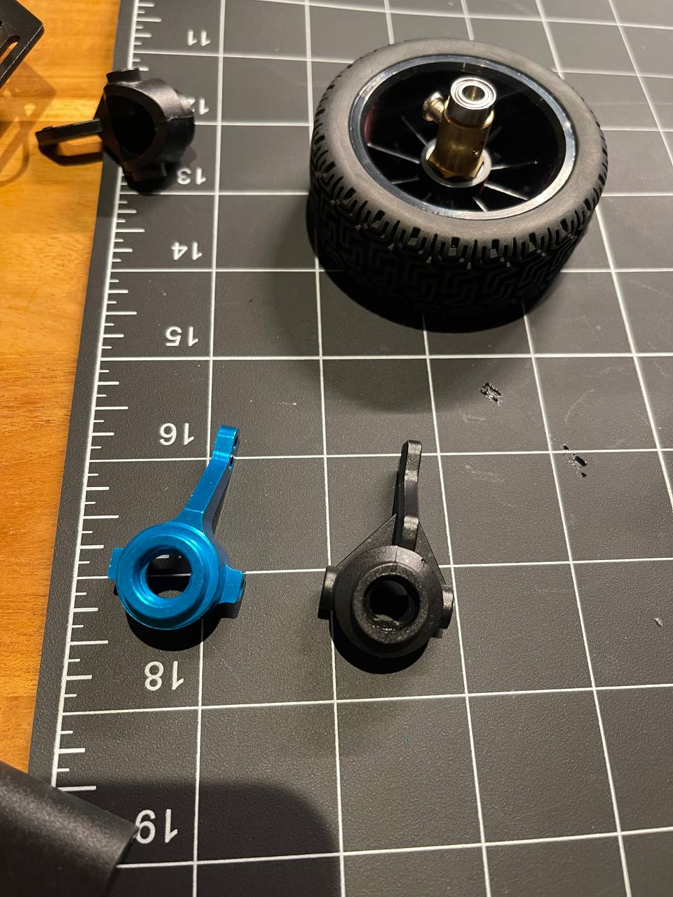 Changed the plastic steering hubs to aluminum ones and matched the color to the robotic arm.