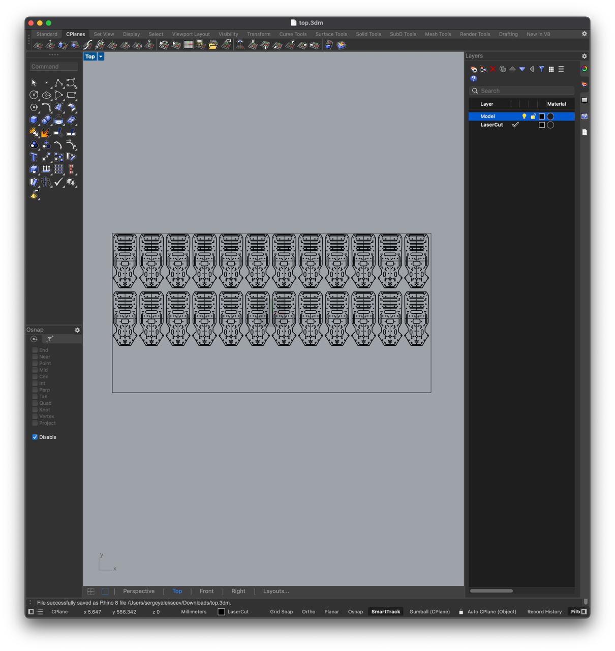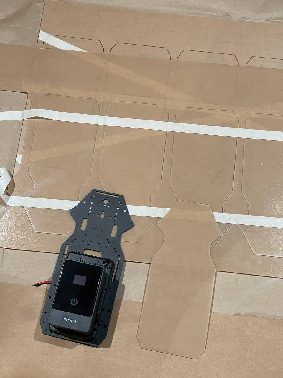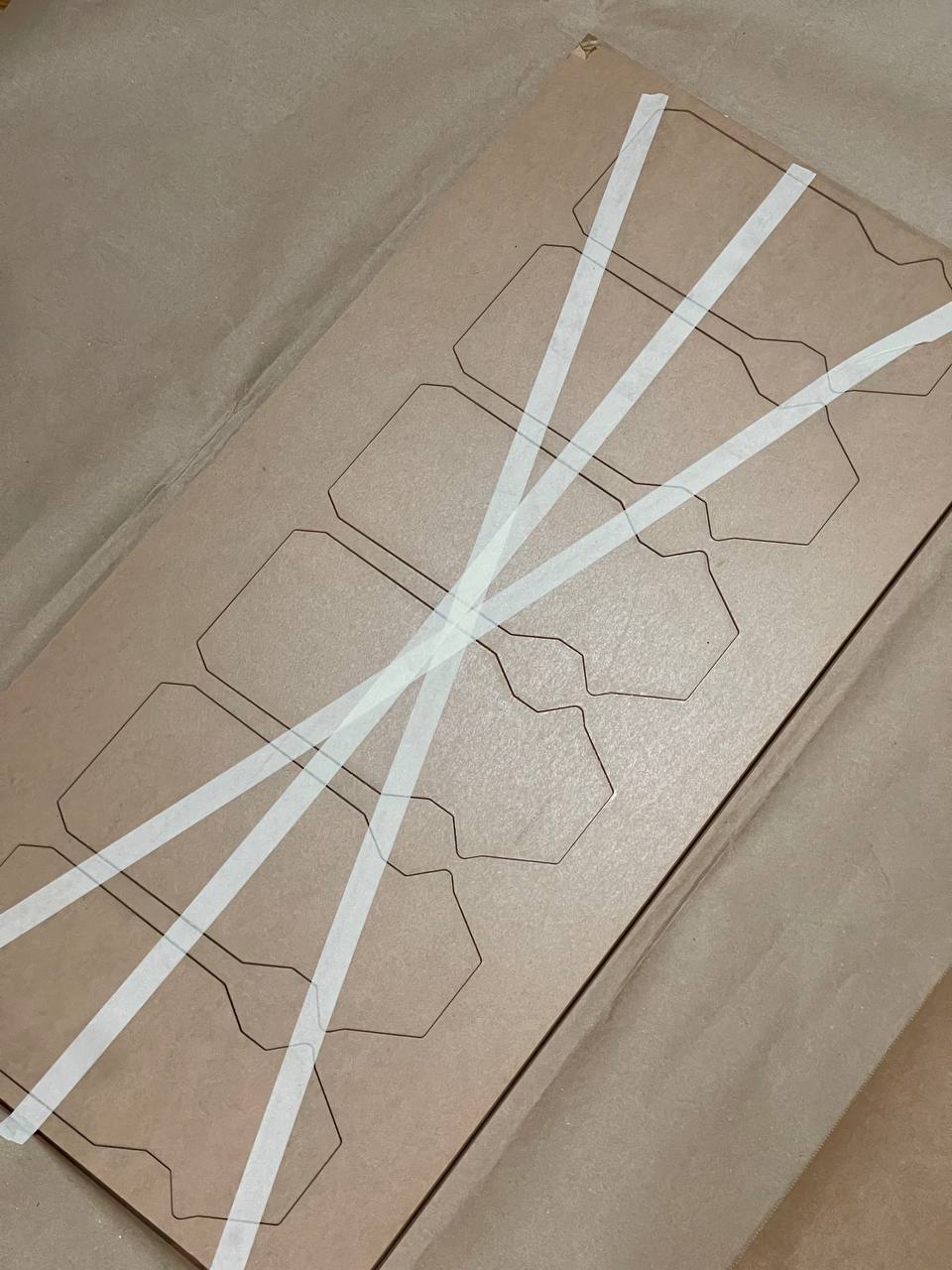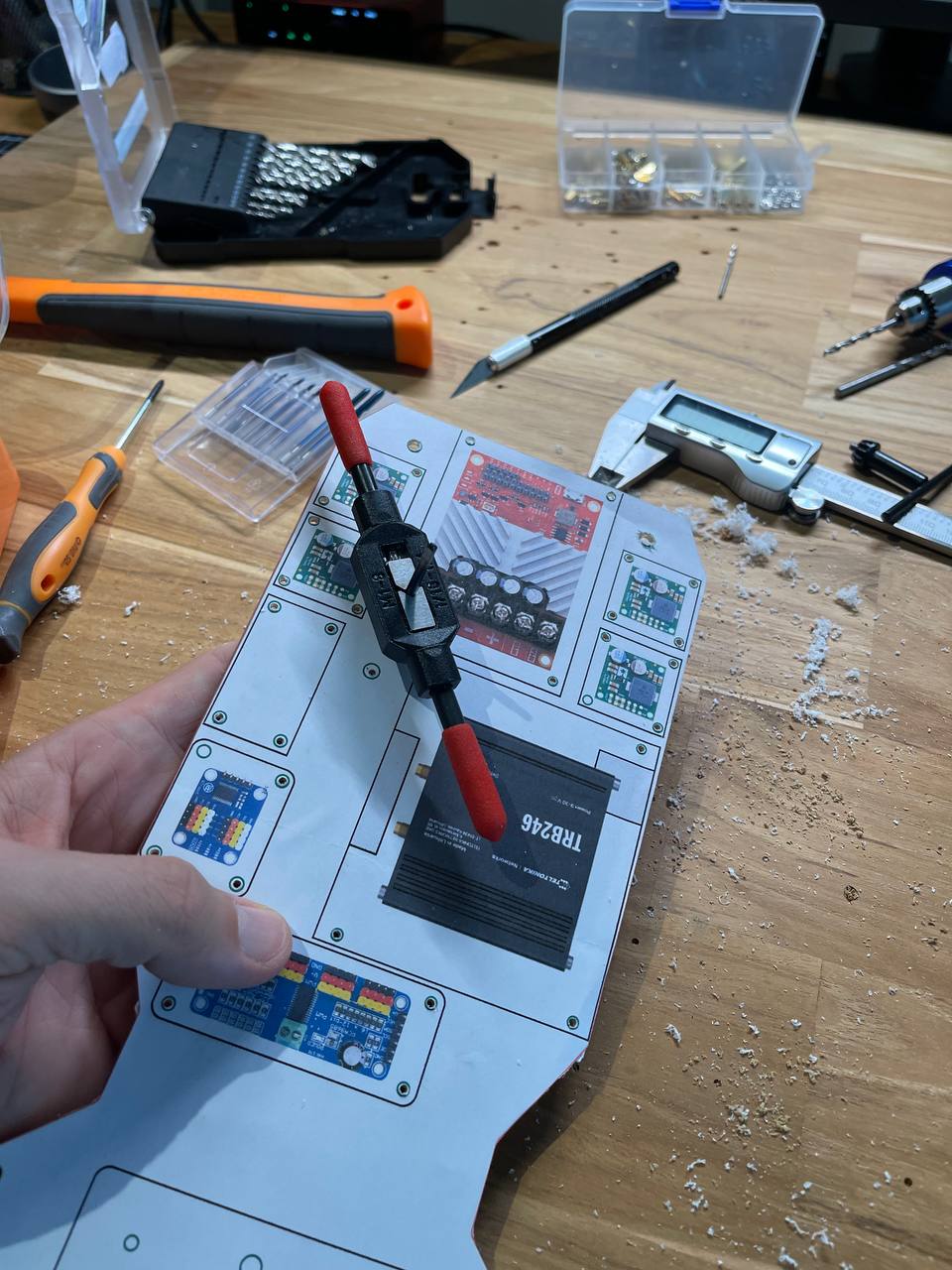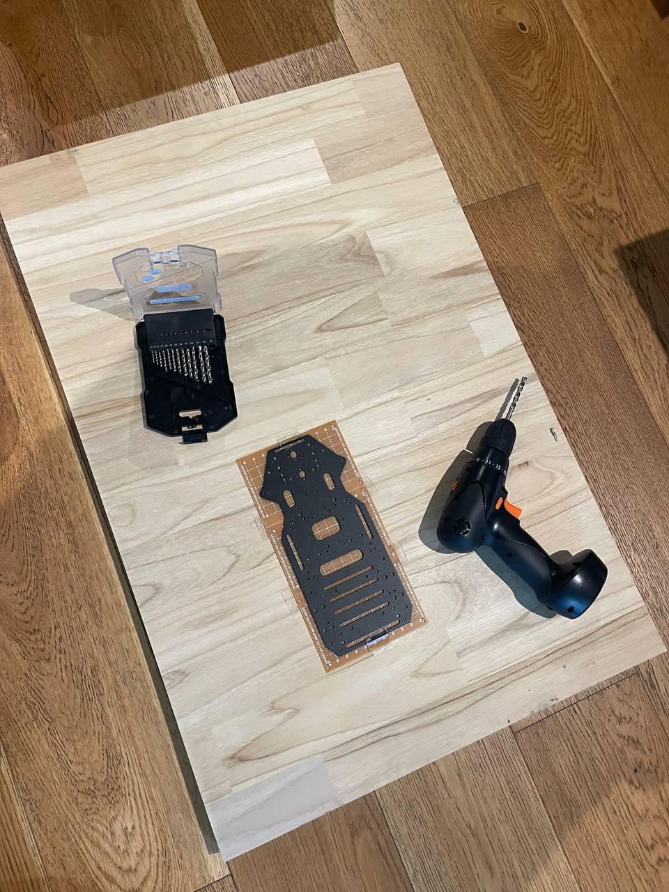 I couldn't handle CAD so I decided to draw everything in Figma. Almost all components had datasheets with dimensions but some I had to measure by hand to place the holes accurately. Then I went to Denis and printed out the layout for the components and holes. I glued it to the sheets I cut with the laser and drilled the holes.