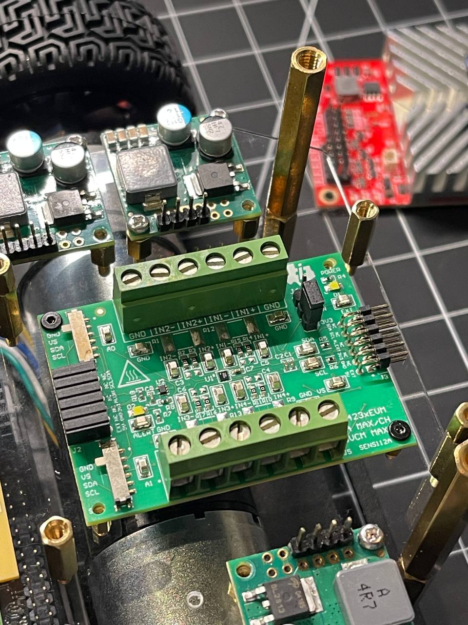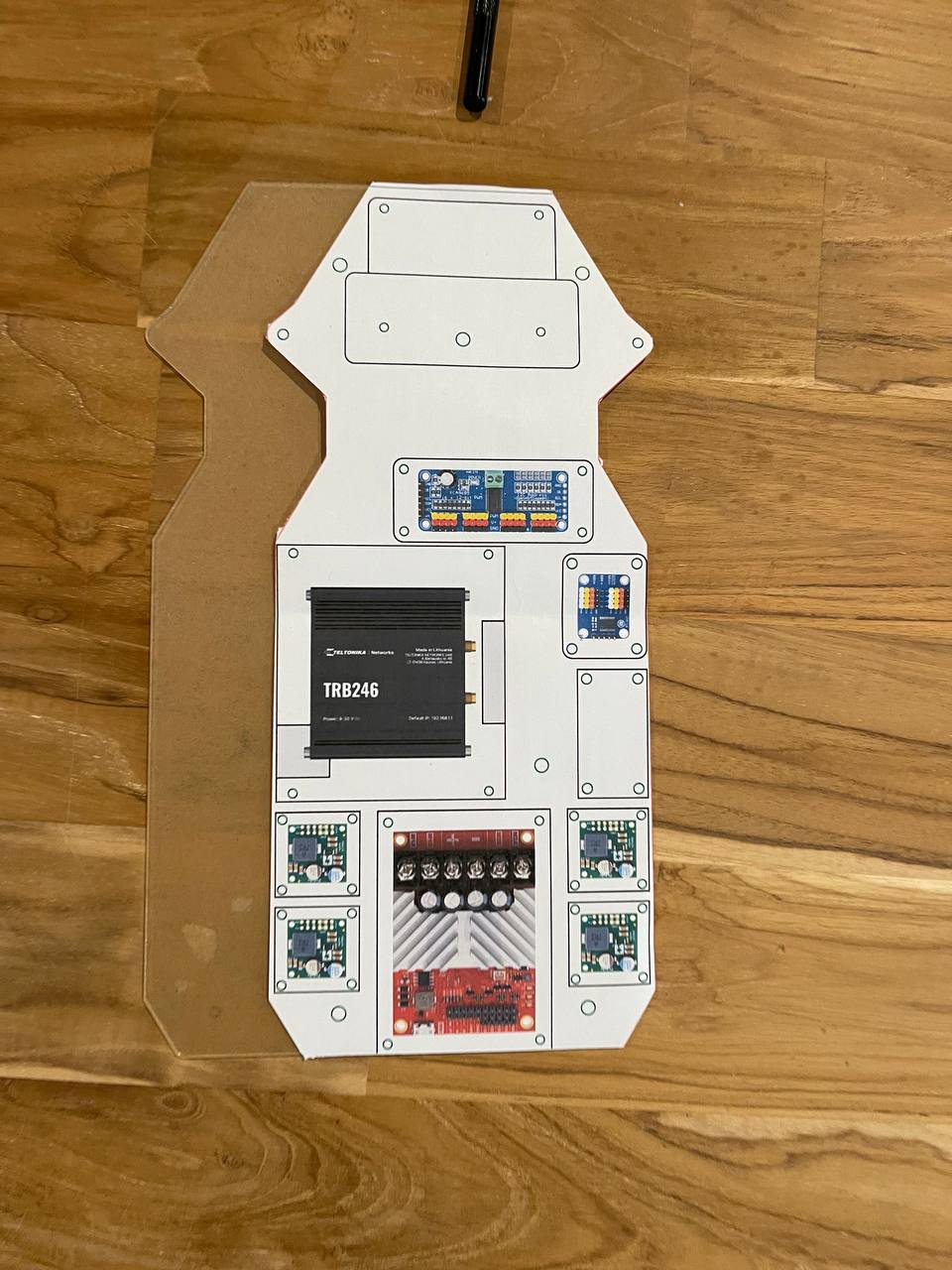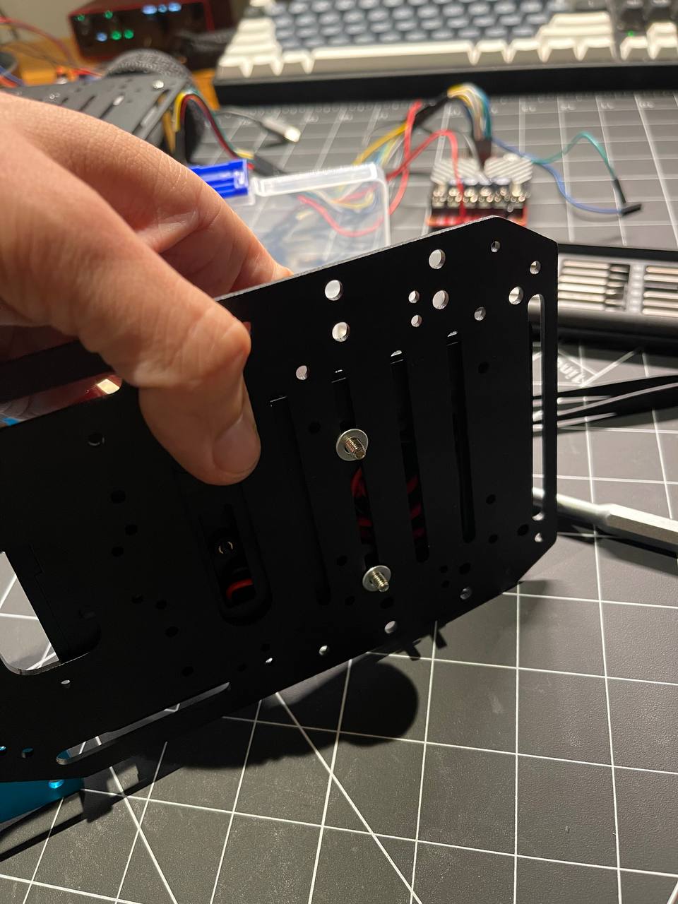I need to mount the PCBs using vertical/horizontal mounts on an acrylic or some other plate that I can easily drill holes in and attach other components to. This way the robot chassis won't get drilled or damaged if I need to redo something.