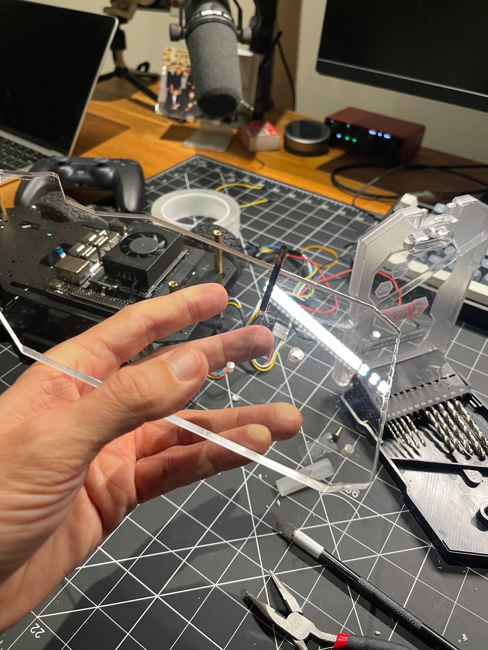 Next I want to place all the boards on acrylic plates. I cut out the shape I needed with a jigsaw, drilled some holes and tapped threads to screw in the standoffs.