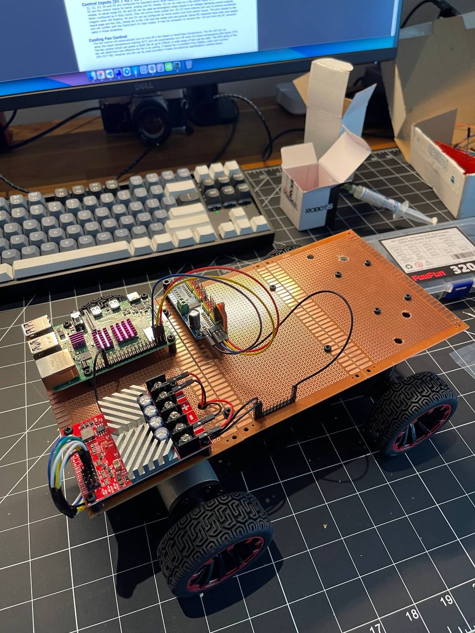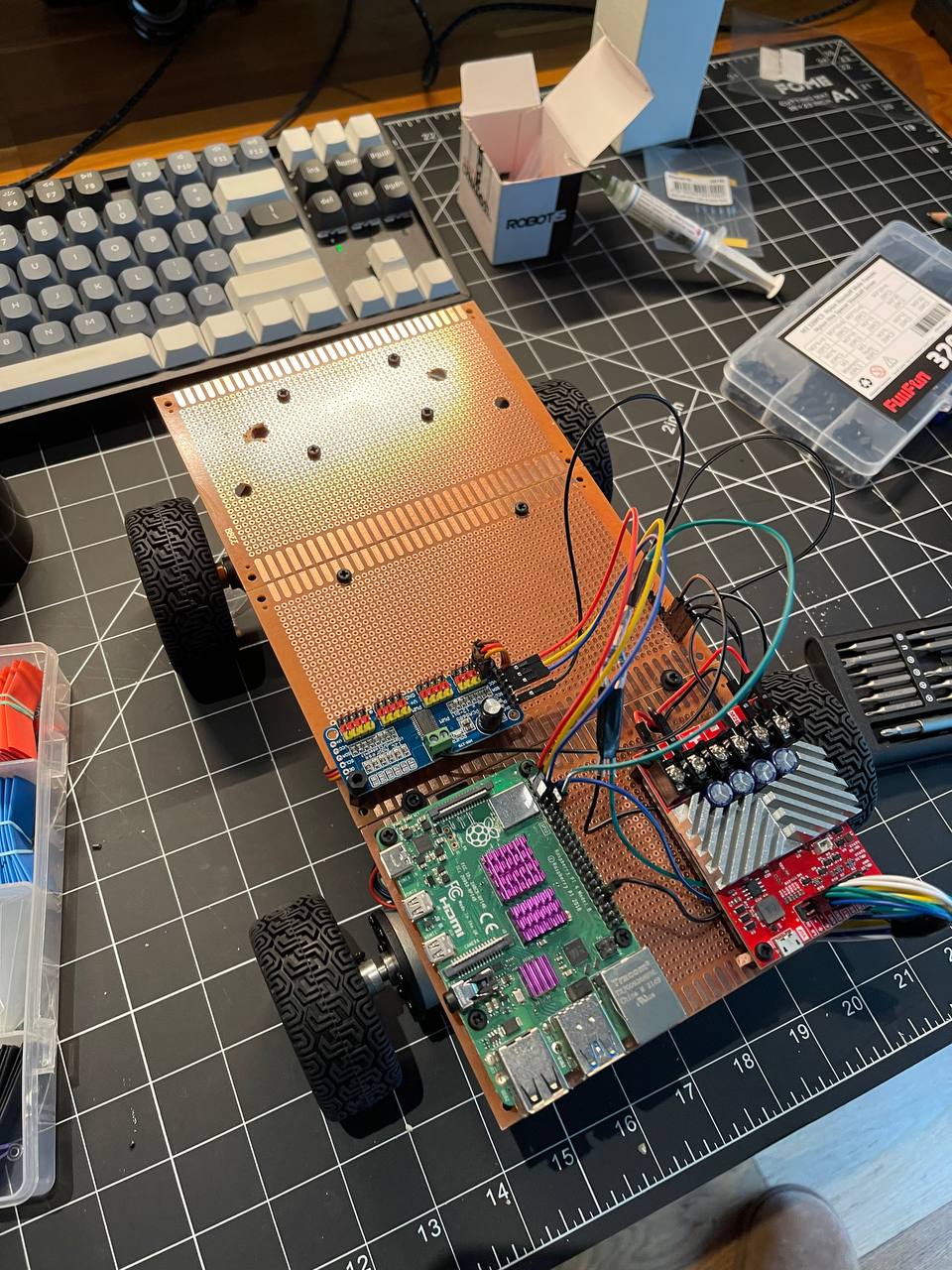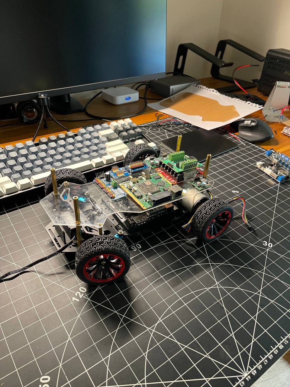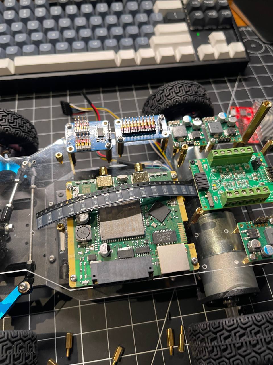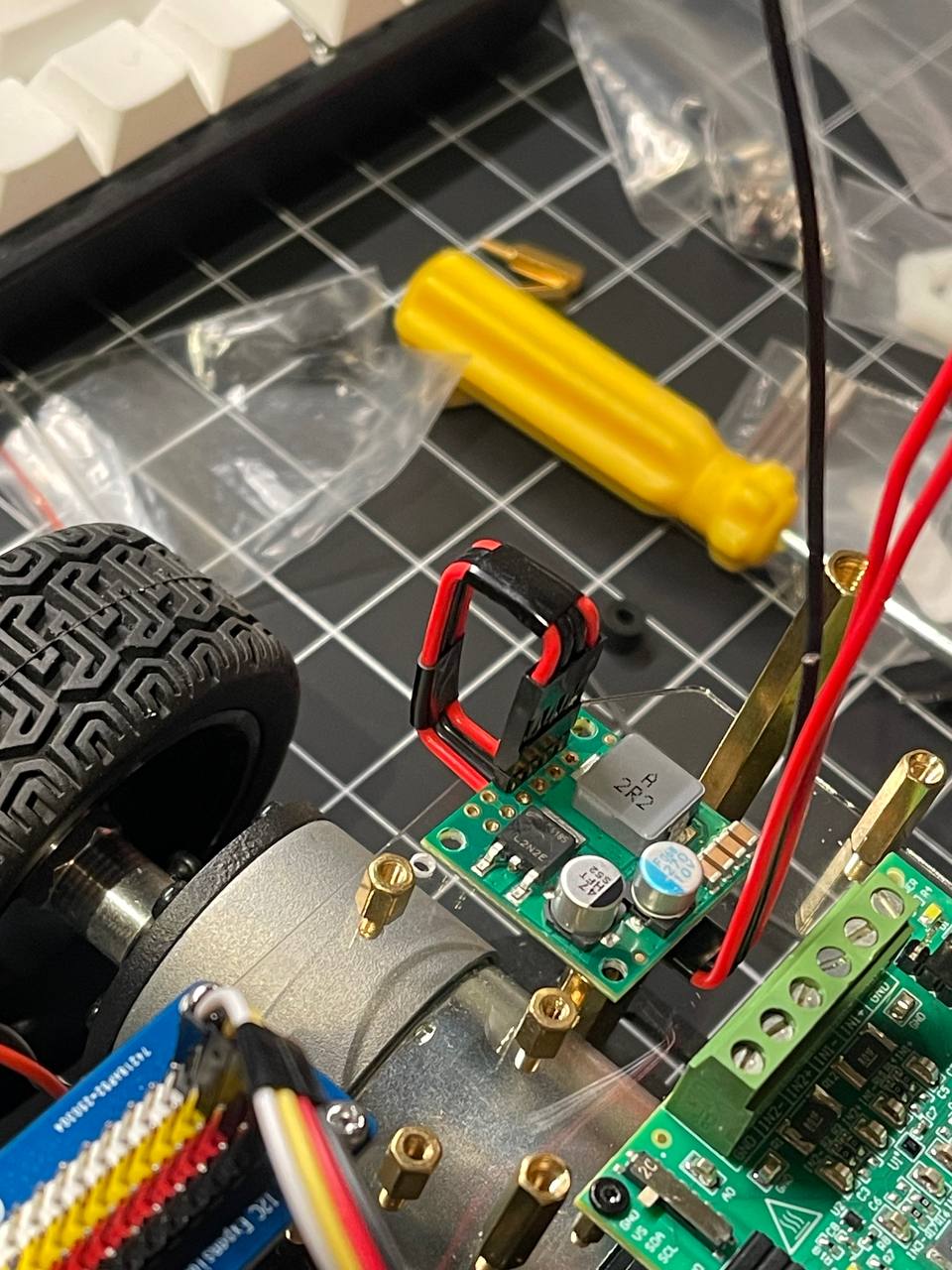 Going back to the board. I got really lucky ordering nylon standoffs from Amazon. First, I fixed the steering mechanism by making the arms a bit longer. Second, these standoffs make it super easy to place all the PCBs on the prototyping board.