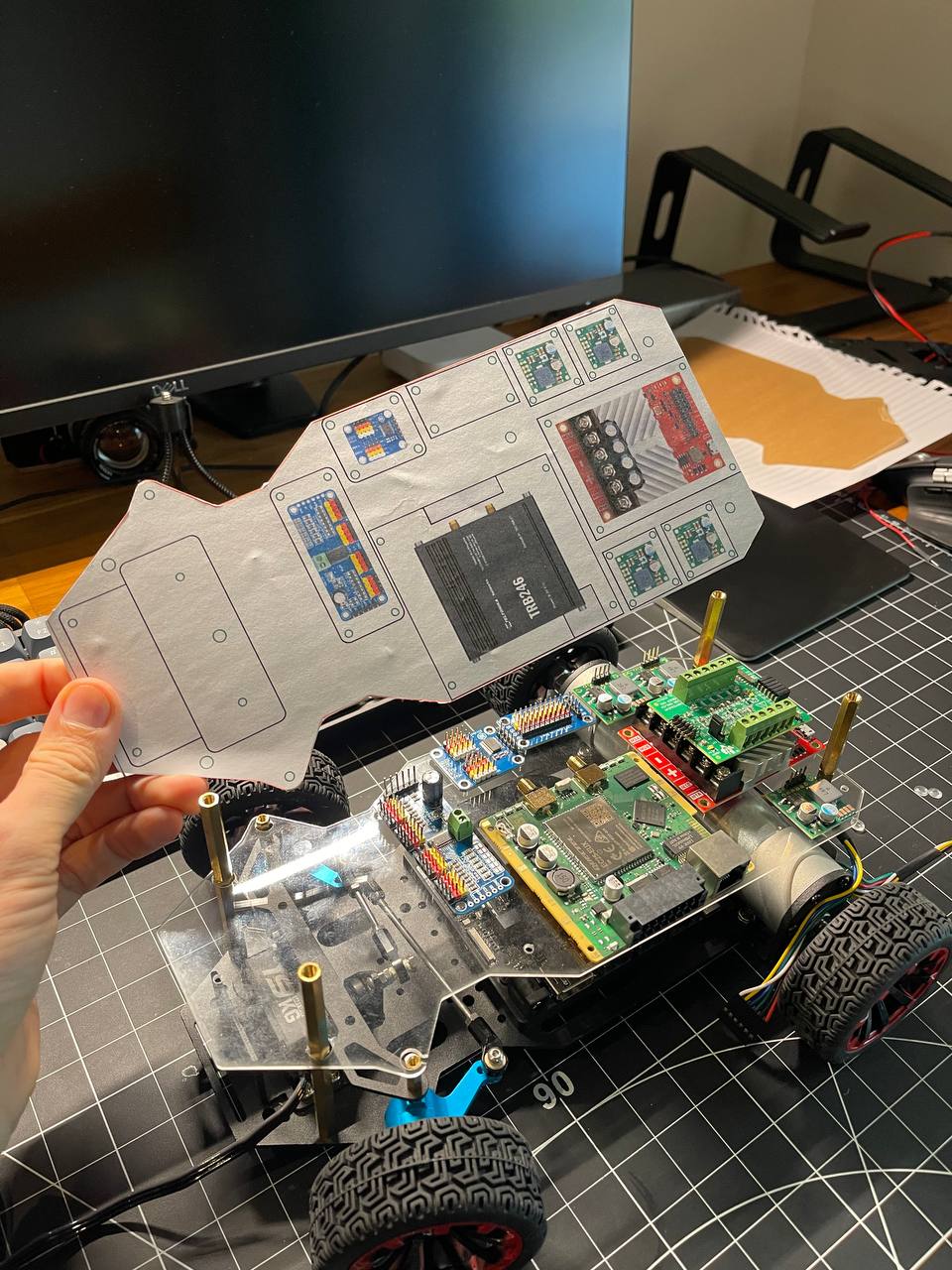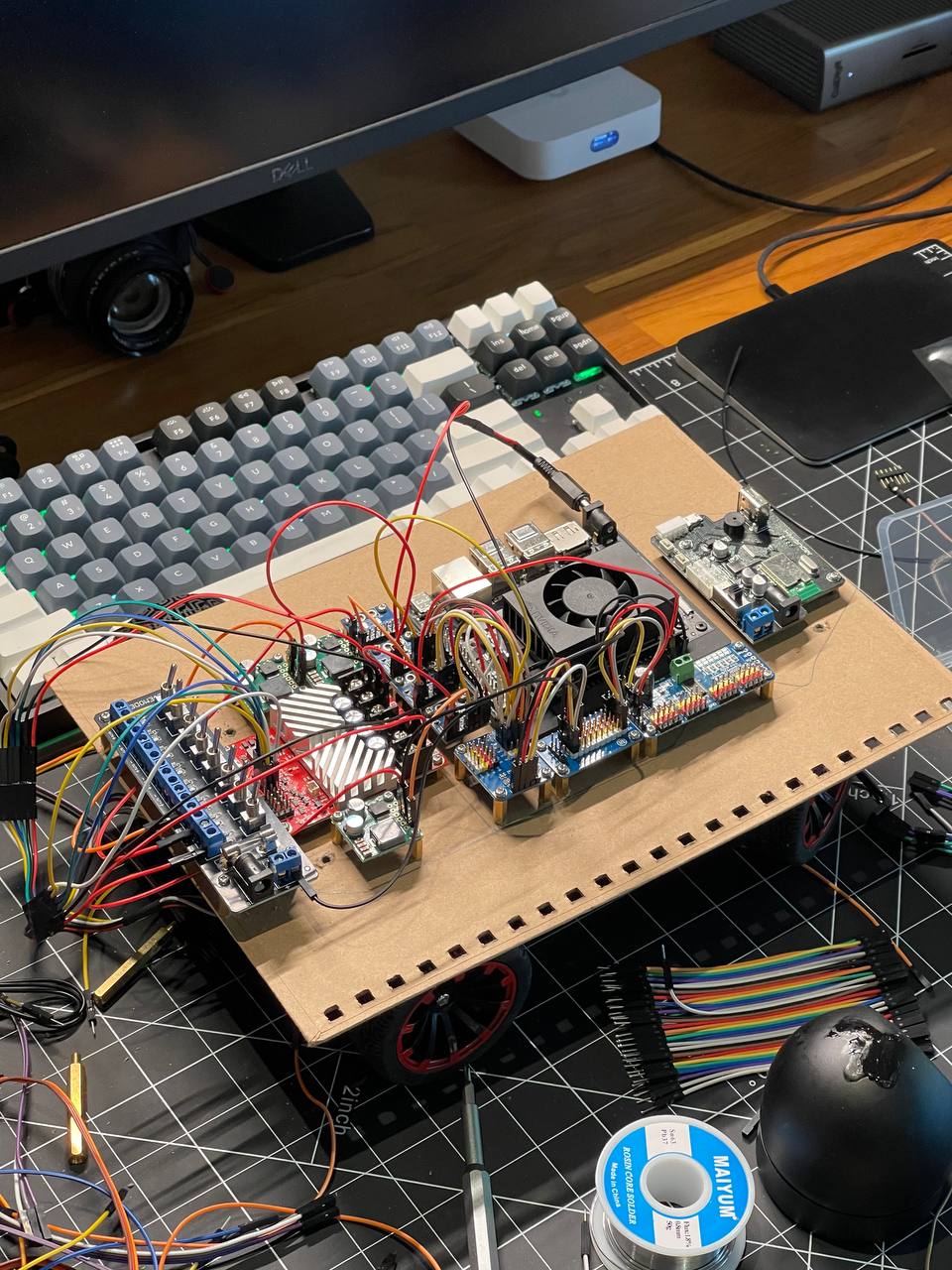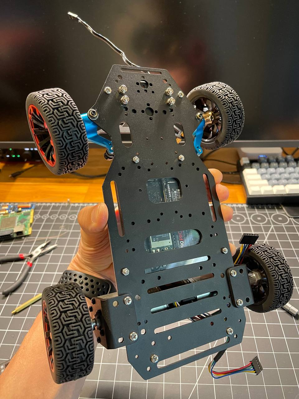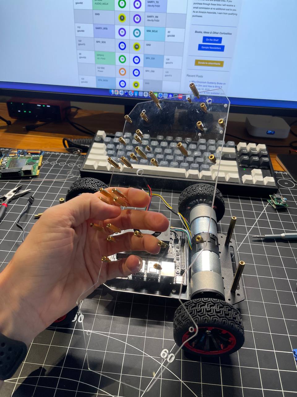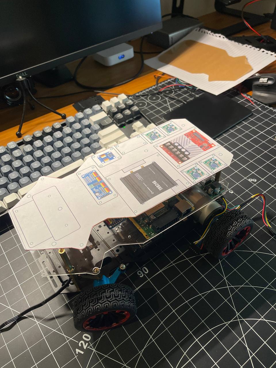 Going back to the board. I got really lucky ordering nylon standoffs from Amazon. First, I fixed the steering mechanism by making the arms a bit longer. Second, these standoffs make it super easy to place all the PCBs on the prototyping board.