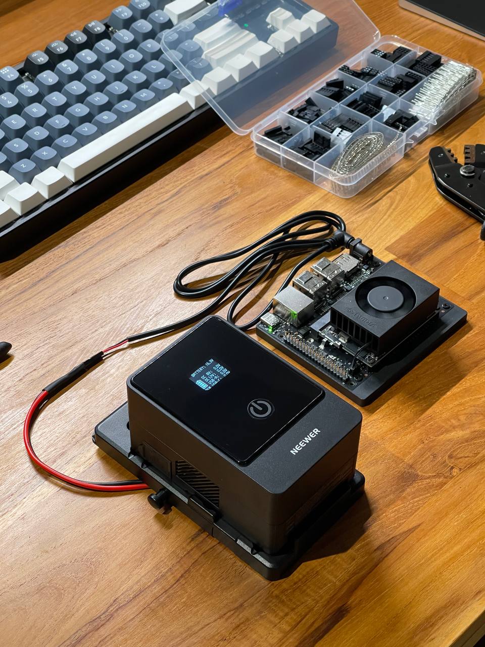 On the third try I ordered the right barrel jack for power and dupont connectors. Crimped everything quickly and checked if it works. According to the dev board specs, it can be powered by 9-20V. The battery at 96% gives 16.2V which is within the limits so I can power it without step down converters.