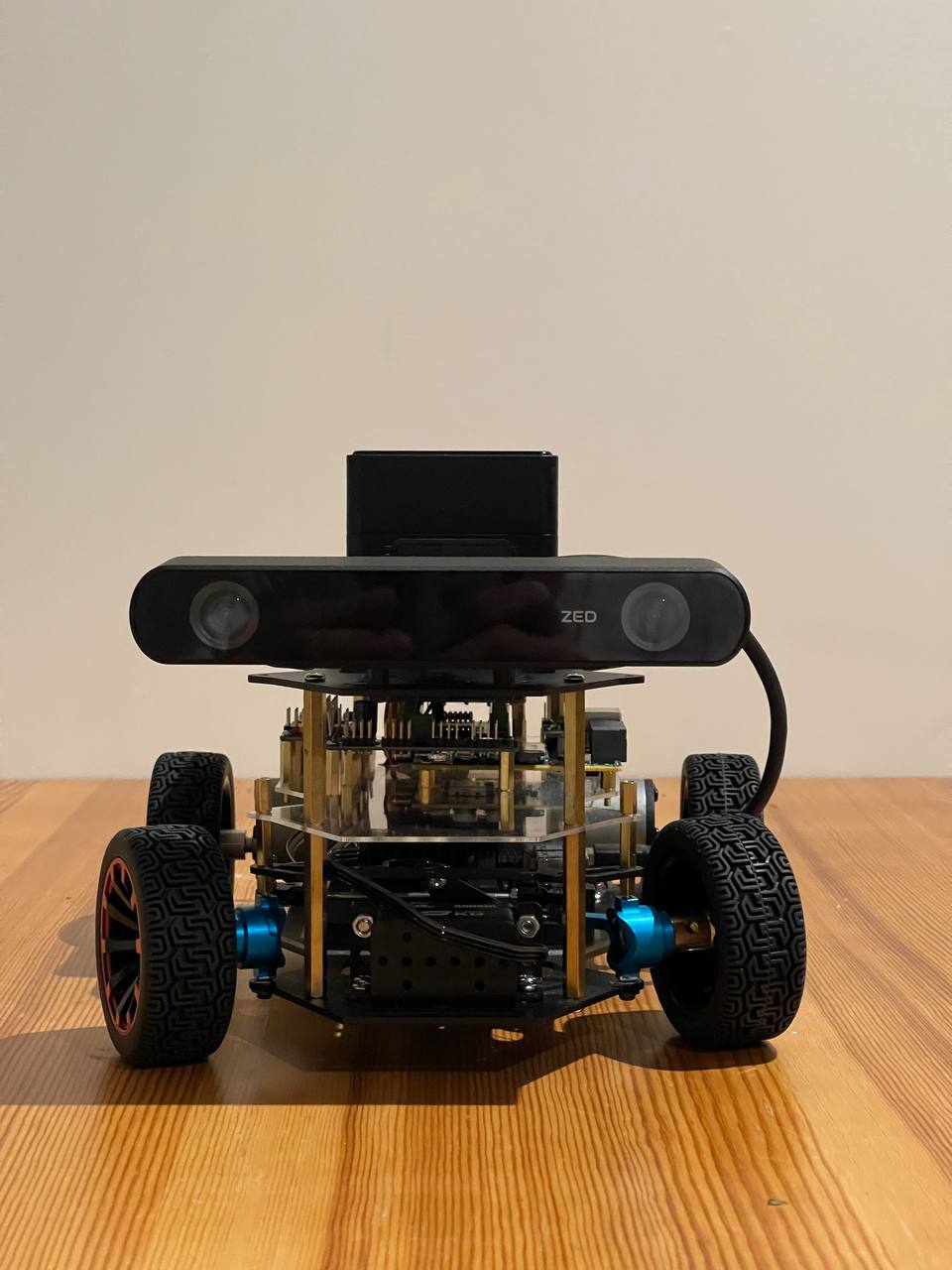 Because the baseline of the stereo pair is pretty wide it can only measure depth from 30 cm. This creates a blind spot in front of the robot. Tolerable but not very nice. Maybe it's worth thinking about a lidar or a proximity sensor for obstacle avoidance.