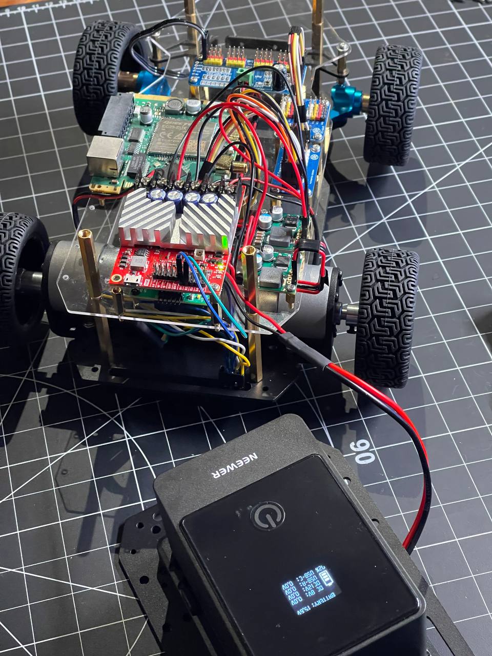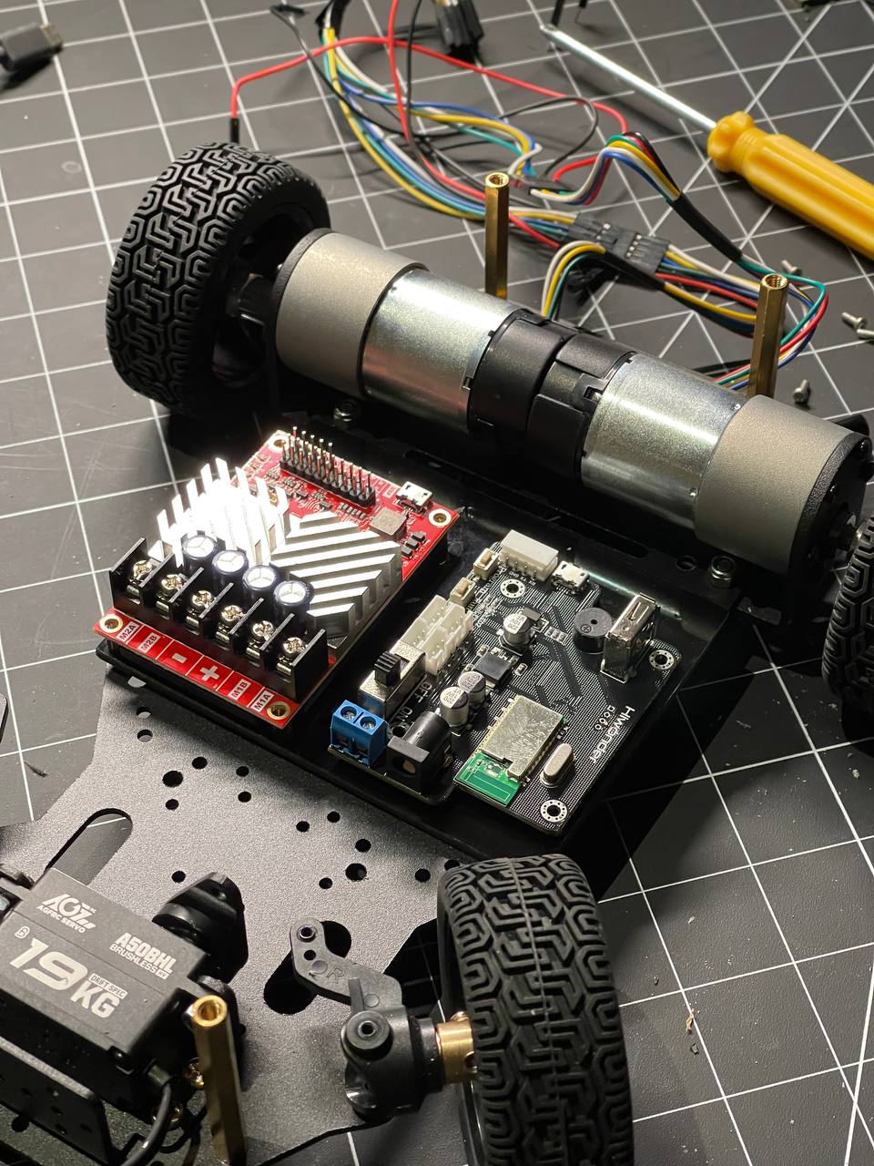 First ride. The steering is a bit off balance, the turn angle is too small, I should increase it and adjust the pwm pulses. The motors are kind of slow, I need to either get bigger wheels or use different gearboxes. But overall I'm really happy that it moved.
