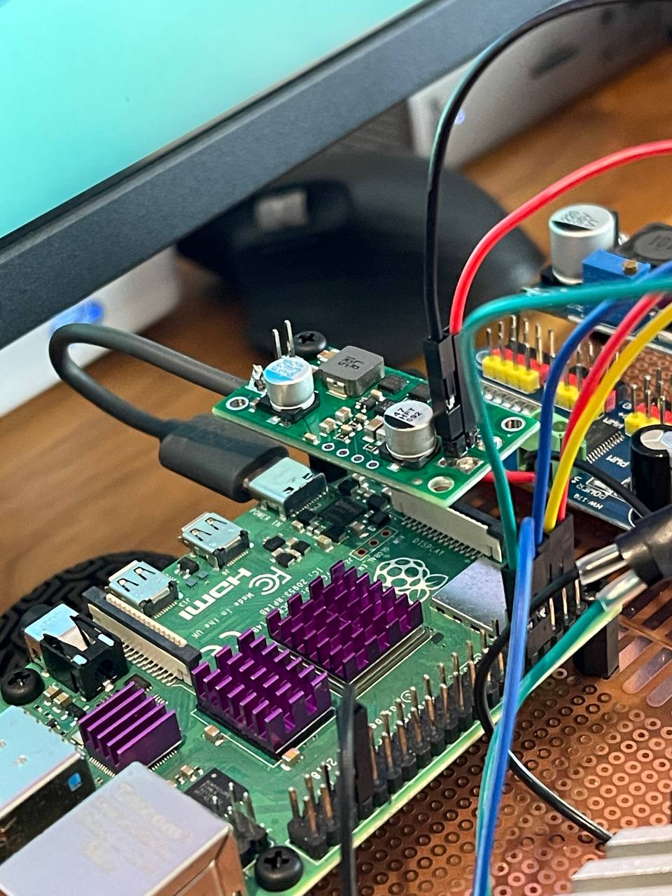 At first I thought about powering the rpi directly from gpio 2 or 4 but decided not to do it so I don't fry it by accident. In the end I took a step-down regulator polou 5V D24V90F5 and soldered a usbc cable to connect them. Maybe this could also be done a bit neater.