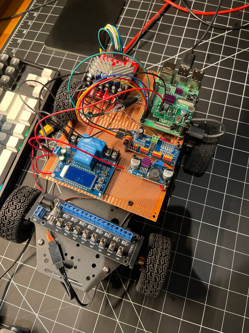 Wired up the rear motor controller, voltage sensor, 2 step down regulators - one for the servo steering, the other for the motors and controller - and started it up from the battery. Looks like nothing smoked, that's a good sign.