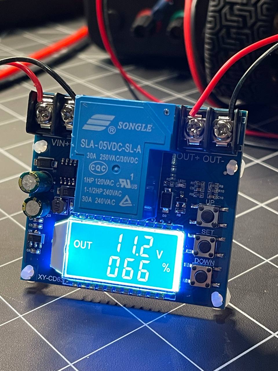 On the left is a discharge controller with a screen where you can show voltage and charge percentage and an estimated time if you set the battery parameters. When it hits the lower threshold the relay cuts off the circuit so you donāt over-discharge the battery. Not super useful for lipo though.