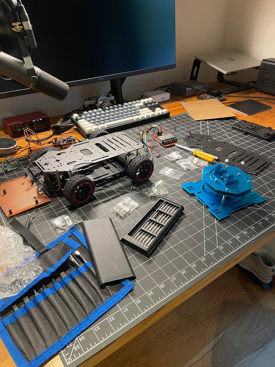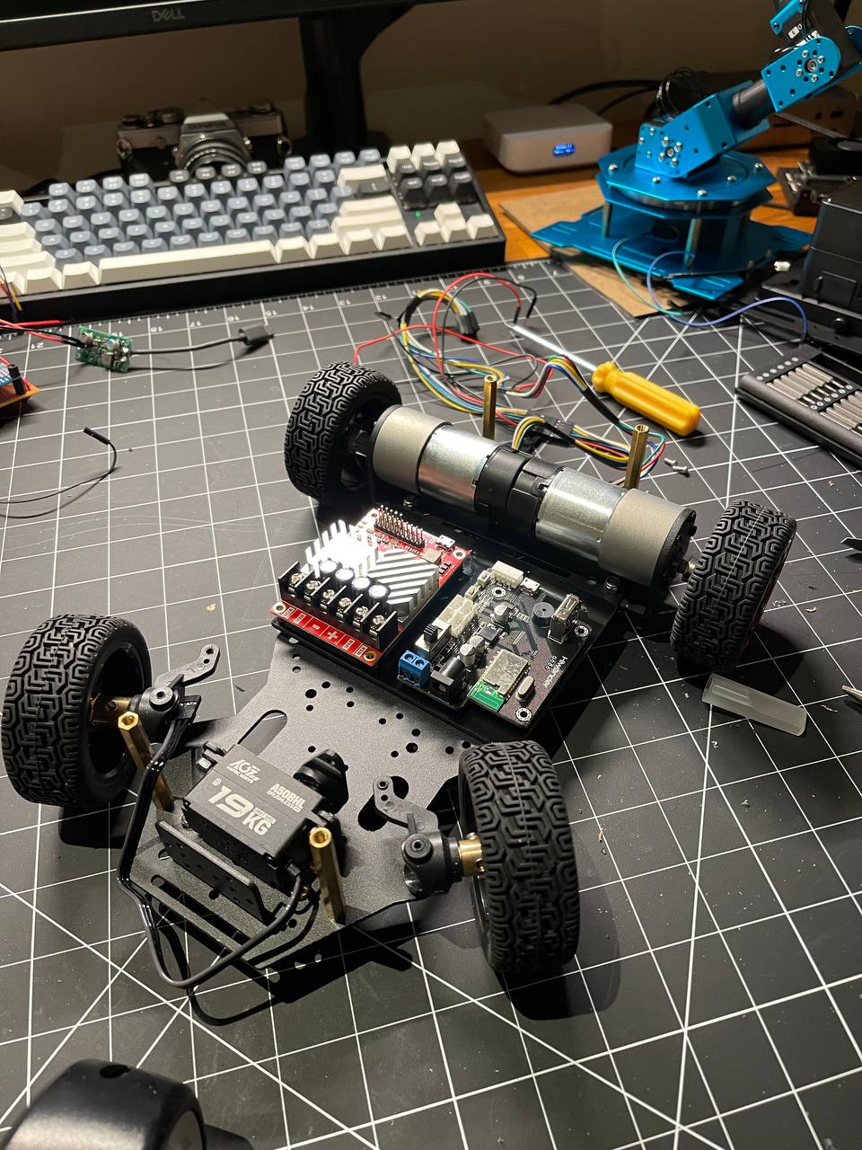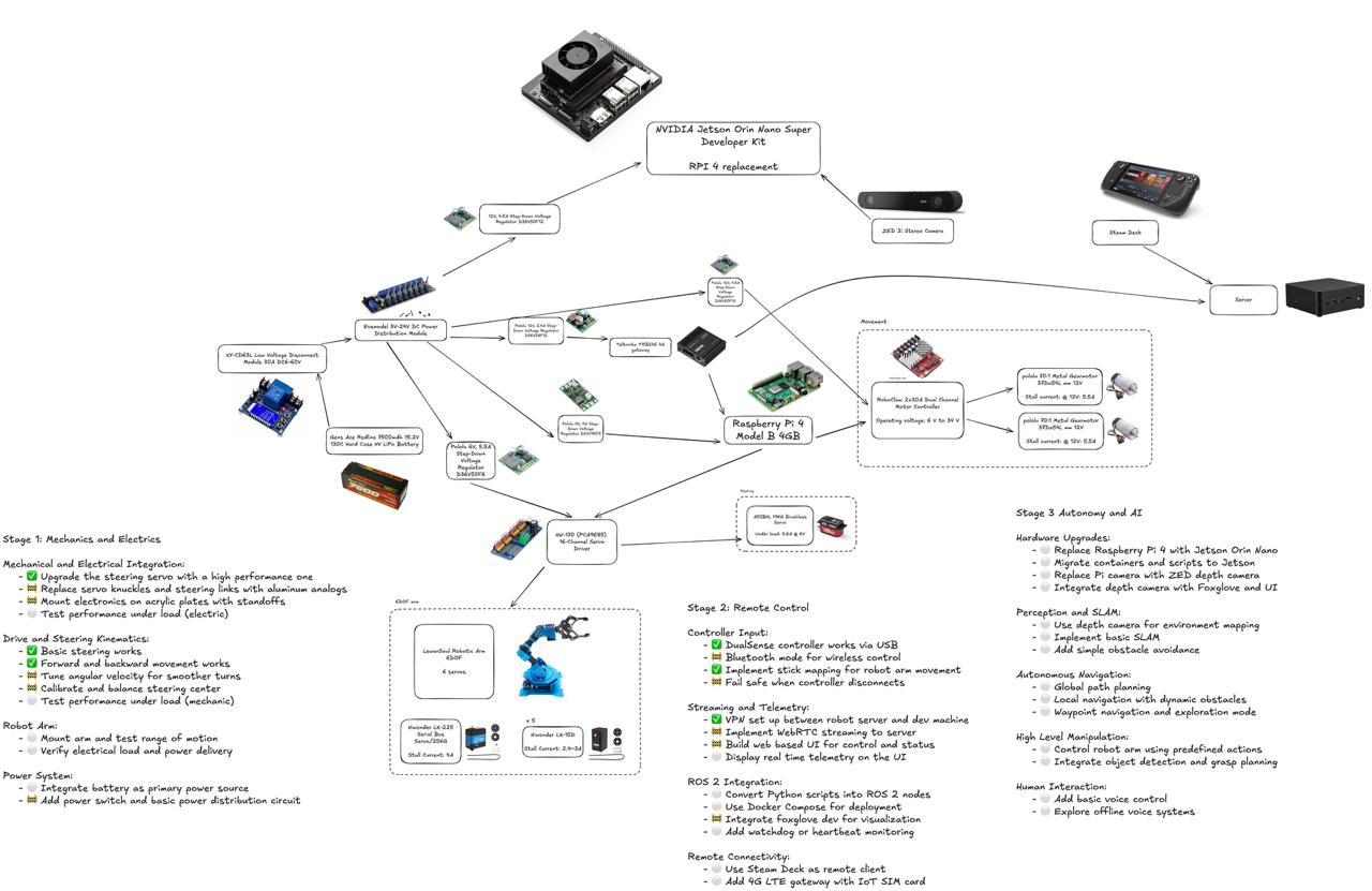 Decided to dust off my soldering skills a bit and mix that with what Iāve learned working as a full-stack dev. I want to build a robot that can be controlled over the internet and uses Ackermann steering. The second step is to dive deeper into ROS2 and autonomous navigation.