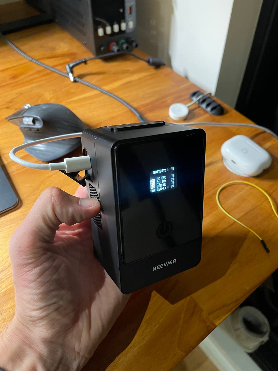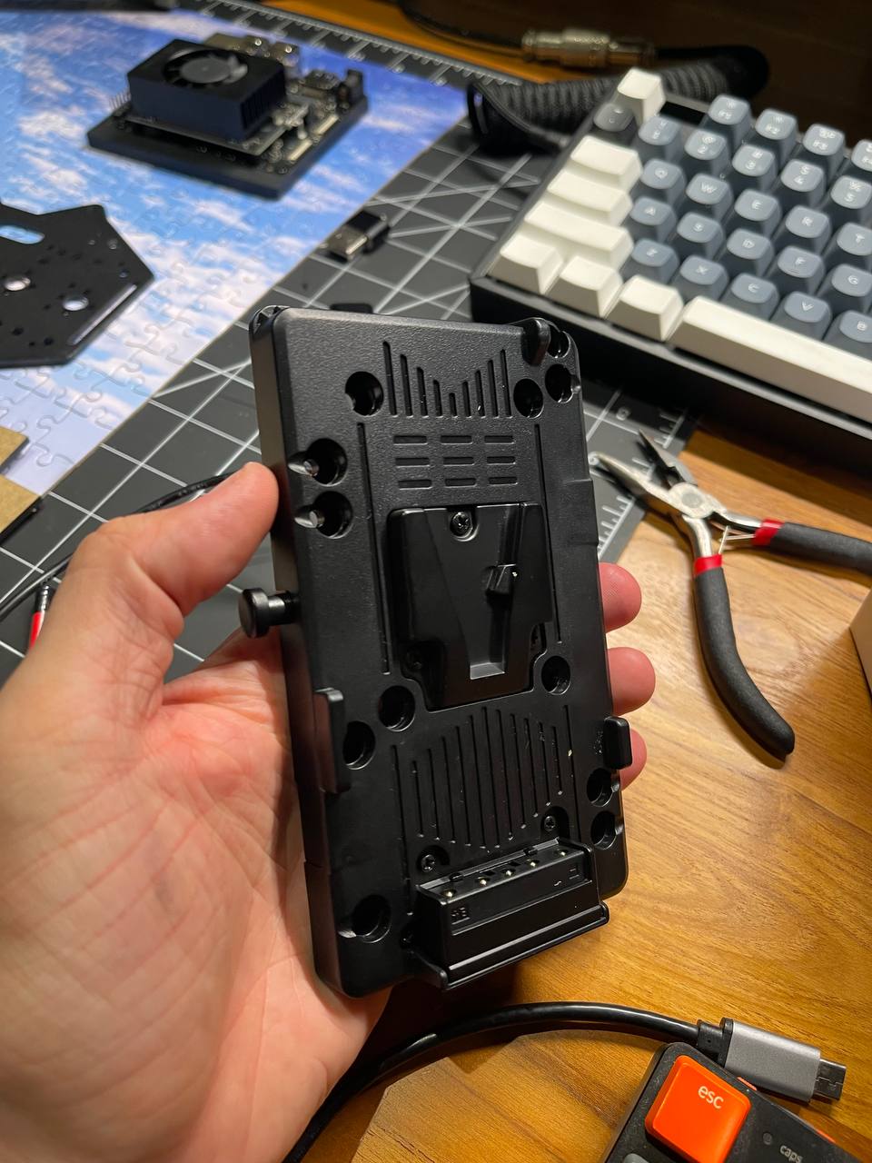 About power supply. At first, I was thinking of using an rc lipo at 7000mah but decided to drop that idea. It bothers me a bit that these batteries can be (even if unlikely) pretty dangerous. You need to keep an eye on them while charging and they don't have a built-in BMS. But they can deliver way more discharge current (though I probably won't need > 10A) and they're much lighter than a stack of 18650s. I spent a long time choosing and eventually stumbled upon V mount batteries which are used in professional video production. These are already assembled 18650 packs with a built-in BMS. They can output 14.45V at 14A which seems more than enough and they have quite a decent capacity.