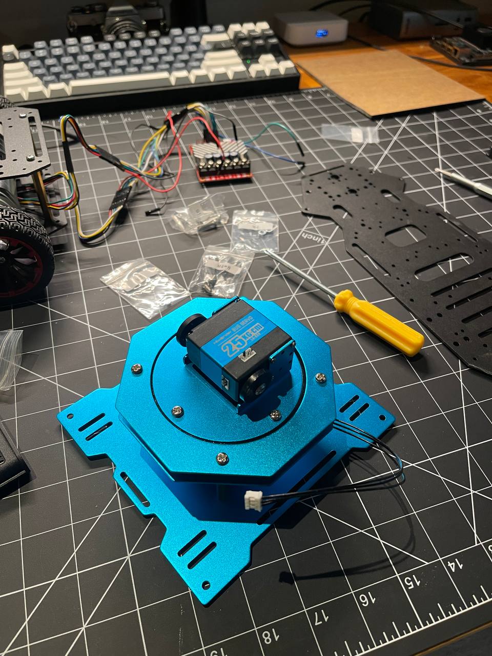 The servo works too but I'm waiting for a quieter and more precise brushless servo from AliExpress. Once it arrives I'll swap it.